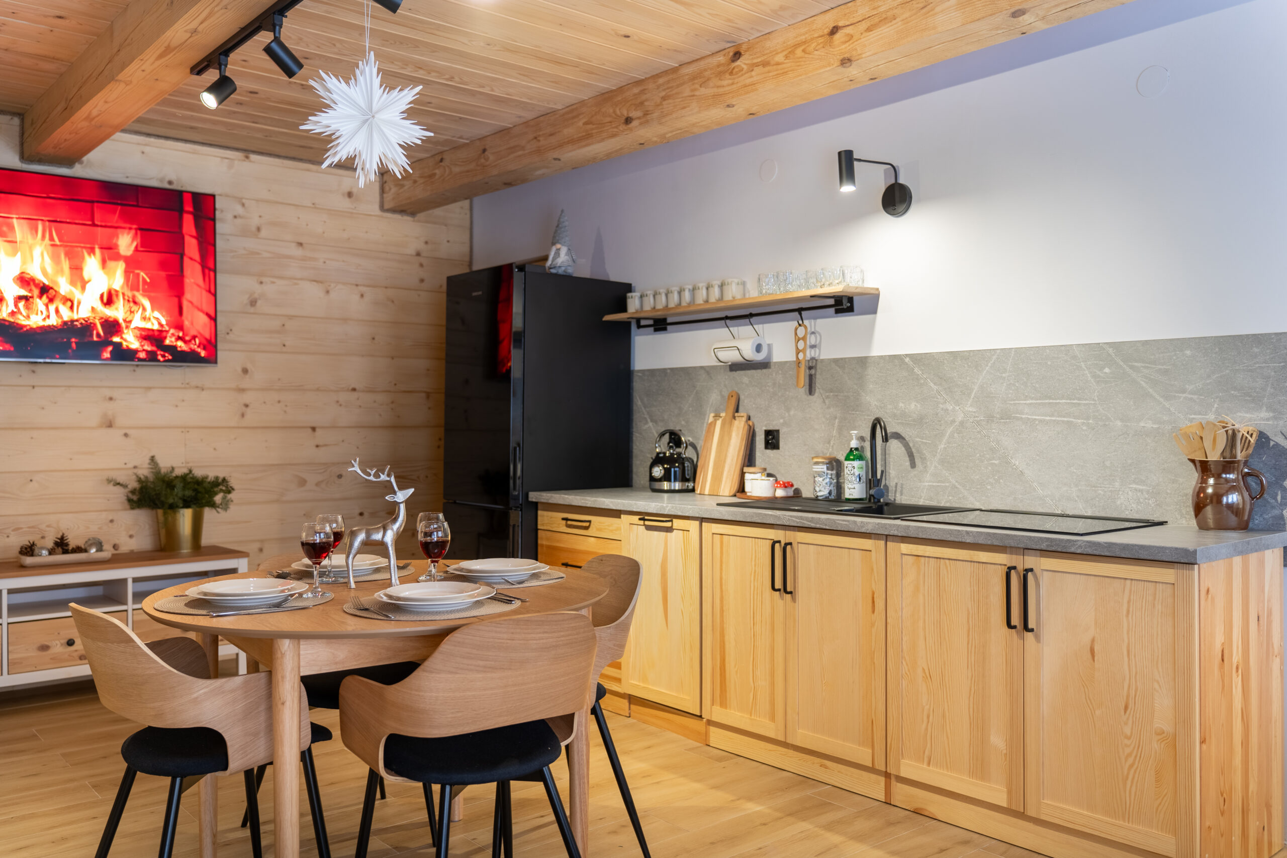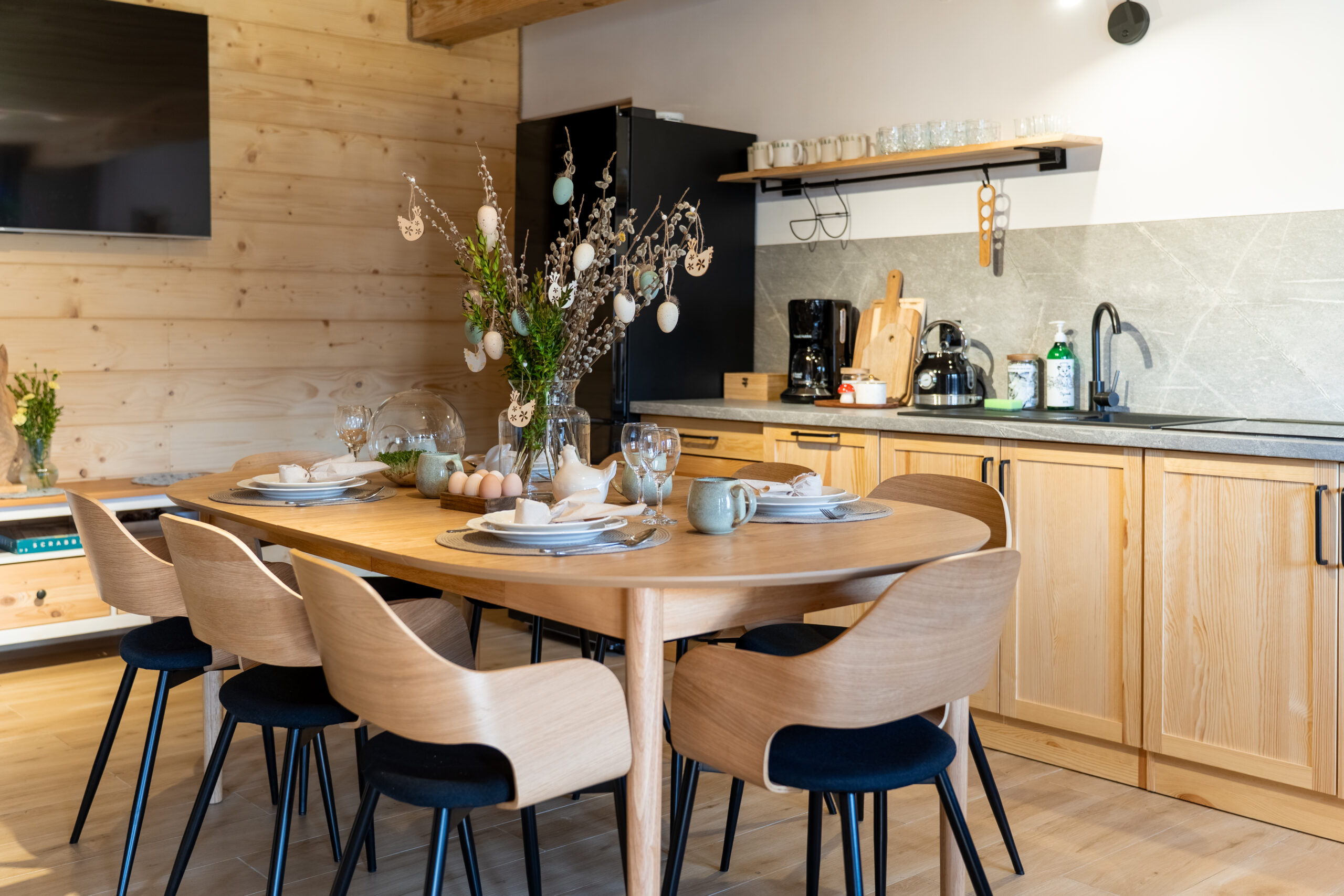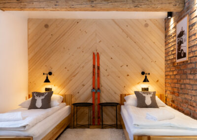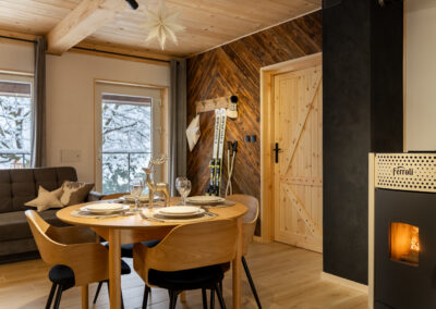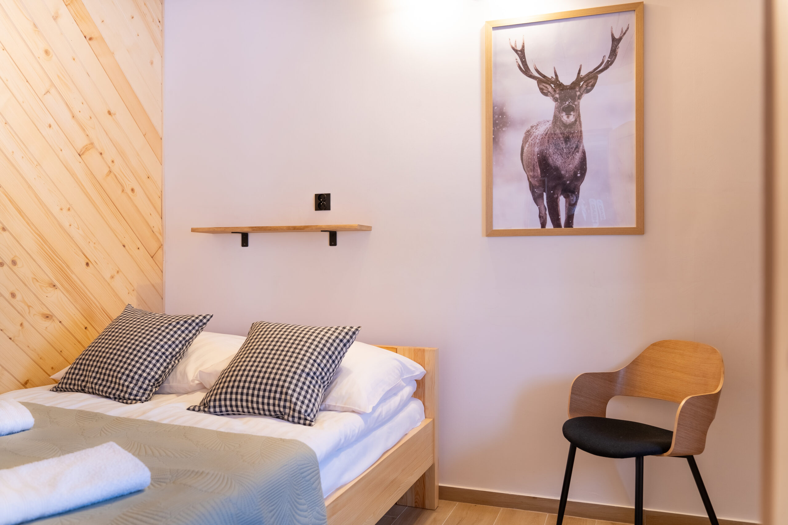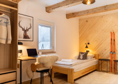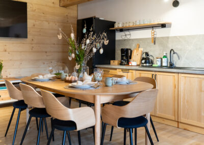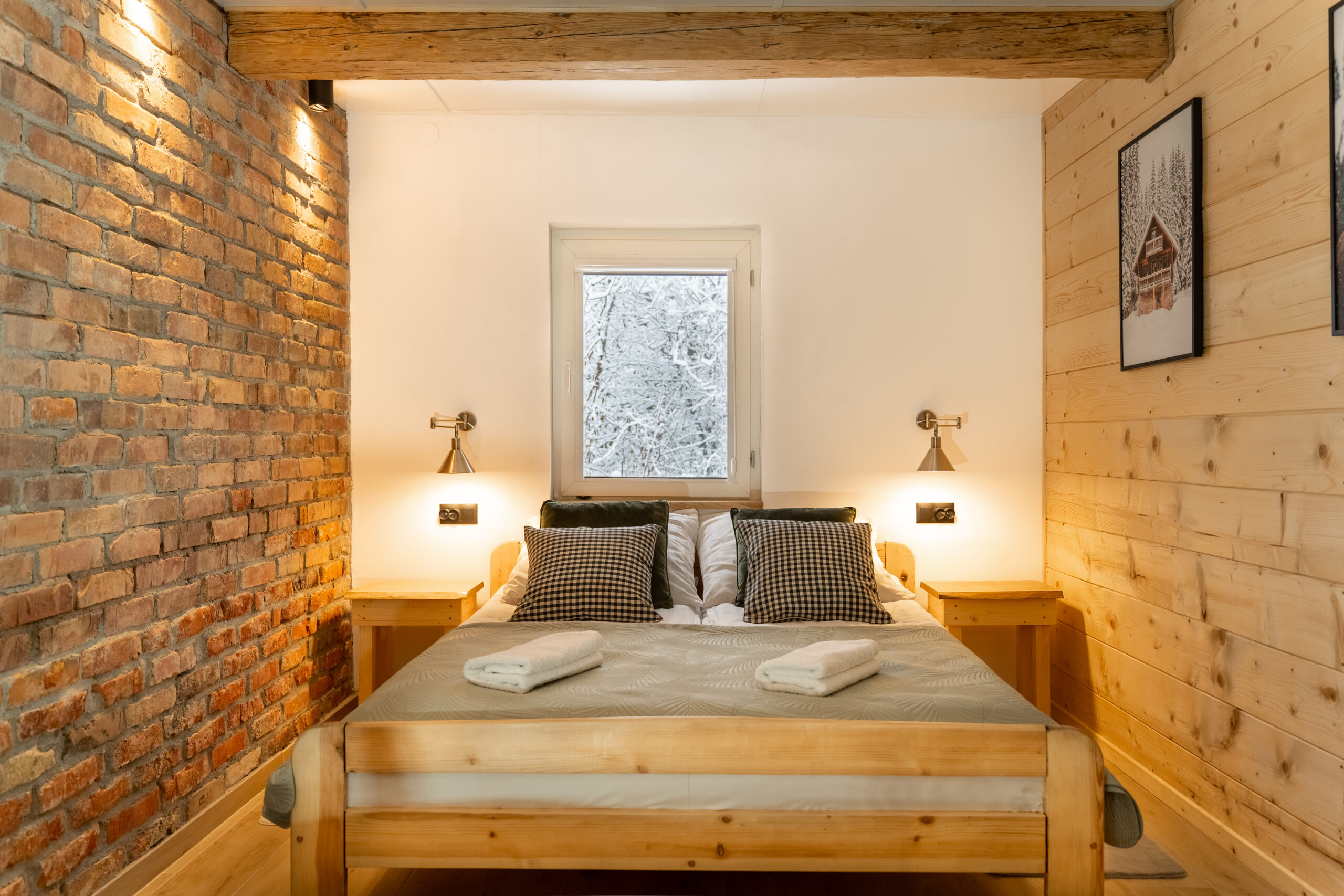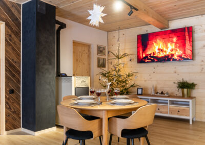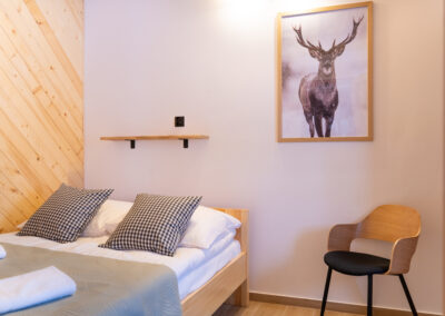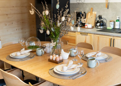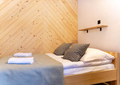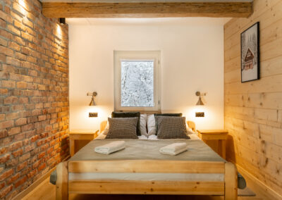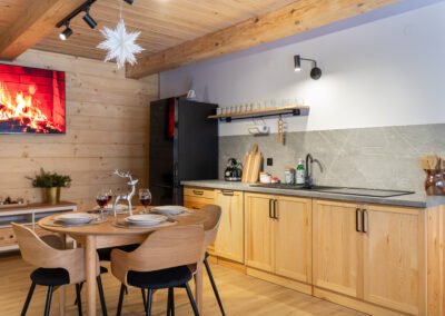 W Chacie do dyspozycji gości są 3 sypialnie 2-osobowe, salon z rozkładaną sofą, łazienka oraz aneks kuchenny z pełnym wyposażeniem (lodówka, zmywarka, zastawa stołowa, garnki, patelnie itd.) a także prywatny parking przy budynku. Chata wyposażona jest w duży telewizor z smart TV i WiFi. Istnieje możliwość dostawienia łóżeczka niemowlęcego. Zapewniamy pościel oraz ręczniki.